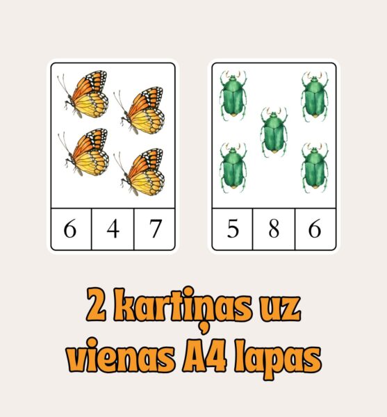 Palīdziet bērniem apgūt skaitļus no 1 līdz 10 un  attīstīt smalko motoriku ar šīm radošajām un izglītojošajām kartītēm! Komplektā ir kartītes ar dažādiem zīmējumiem, kur katrā attēlā attēlots noteikts kukaiņu skaits. Bērna uzdevums ir izvēlēties pareizo skaitli no piedāvātajām iespējām un ar knaģi to piestiprināt pie attiecīgā lodziņa uz kartītes.