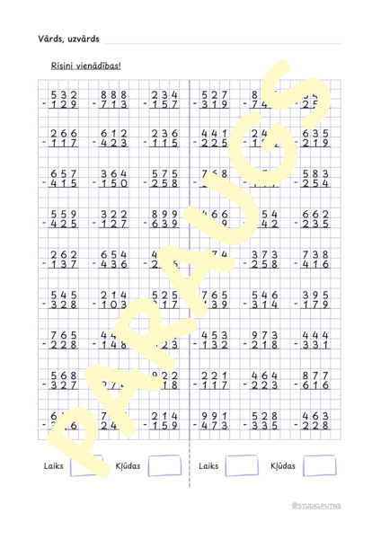 - Ciparu rakstīšanas treniņam standarta rūtiņu formātā, lai attīstītu skaidru un precīzu rokrakstu;