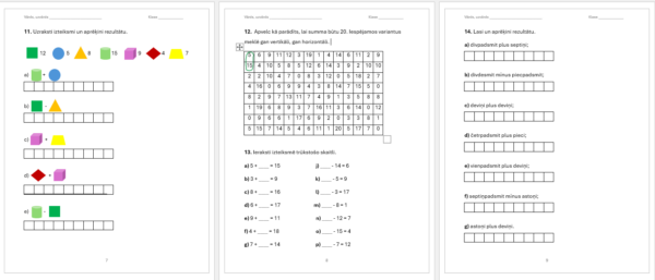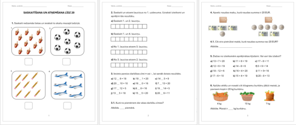 Dažādi uzdevumi saskaitīšanā un atņemšanā līdz 20, kopumā 10 darba lapas. Uzdevumi noderēs kā darba lapas mācību stundā vai kā uzdevumi vielas atkārtošanai.