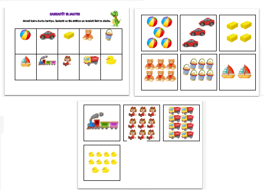 Kartiņas izgriež, lai pēc tam bērns varētu meklēt attiecīgo burtu uz katras kartiņas, saskaitot tur dotos priekšmetus un ierakstot pievienotās lapas tabulā  cik sanāca.
