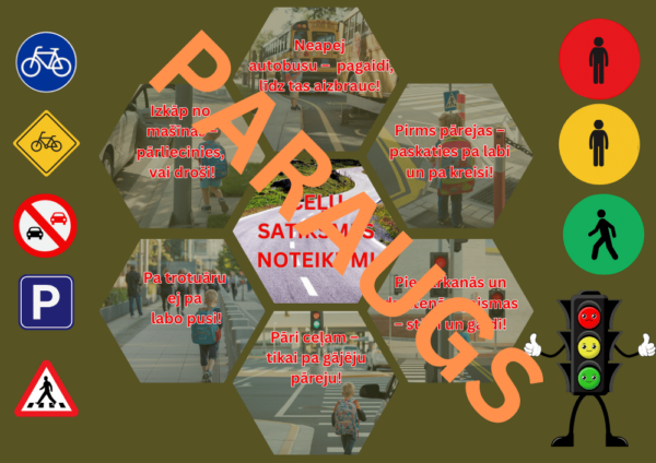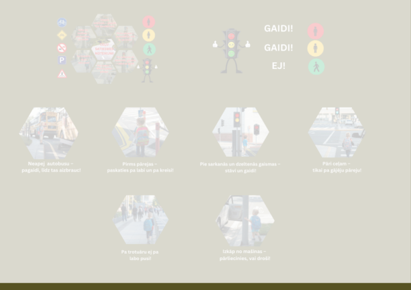 Materiāls ir domāts pirmo klašu skolēniem, lai palīdzētu apgūt un nostiprināt ceļu satiksmes noteikumus. Tas ietver dažādas kartītes ar vienkāršiem, skaidriem un viegli saprotamiem norādījumiem, piemēram: