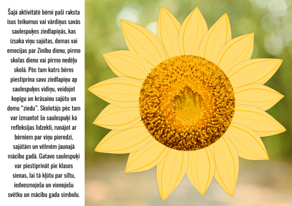 Šajā aktivitātē bērni paši raksta īsus teikumus vai vārdiņus savās saulespuķes ziedlapiņās, kas izsaka viņu sajūtas, domas vai emocijas par Zinību dienu, pirmo skolas dienu vai pirmo nedēļu skolā. Pēc tam katrs bērns piestiprina savu ziedlapiņu ap saulespuķes vidiņu, veidojot kopīgu un krāsainu sajūtu un domu “ziedu”. Skolotājs pēc tam var izmantot šo saulespuķi kā refleksijas līdzekli, runājot ar bērniem par viņu pieredzi, sajūtām un vēlmēm jaunajā mācību gadā. Gatavo saulespuķi var piestiprināt pie klases sienas, lai tā kļūtu par siltu, iedvesmojošu un vienojošu svētku un mācību gada simbolu.