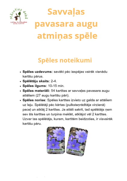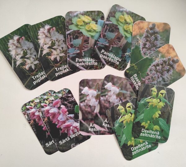 - Spēles materiāli: 54 kartītes ar savvaļas pavasara augu attēliem (27 augu kartīšu pāri).