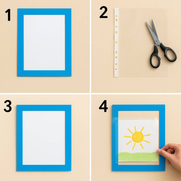 Komplektā iekļauts arī paraugs, kā izgatavot rāmi ar caurspīdīgu kabatiņu bērnu darbiem.