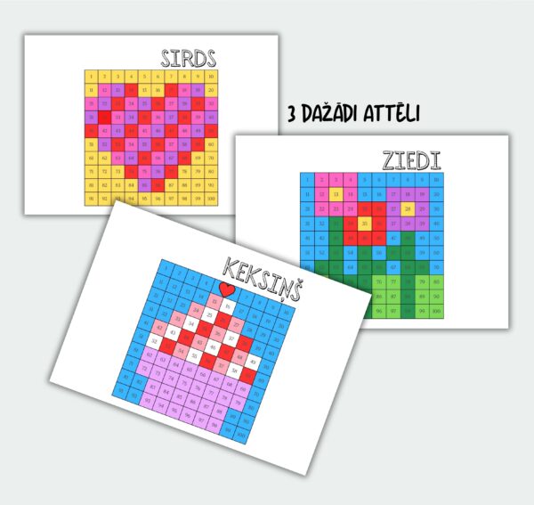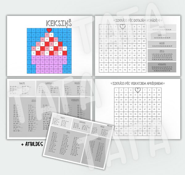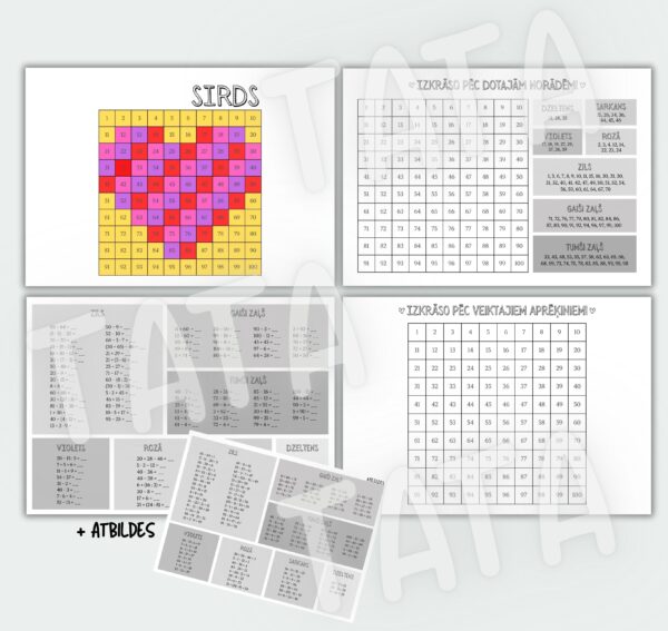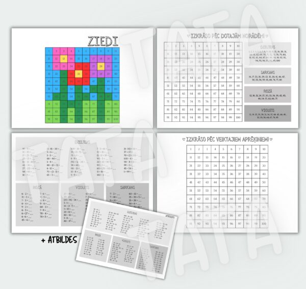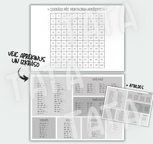 • Sarežģītāks variants – veikt aprēķinus (saskaitīšana un atņemšana 100 apjomā, reizināšana un dalīšana 100 apjomā, saistītais pieraksts) un simta kvadrātā iekrāsot attēlu