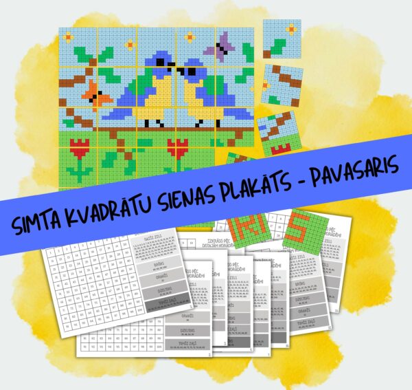 ✍️ Katram skolēnam ir jāizkrāso viena daļiņa no lielā attēla (plakāta). Ja klasē ir mazāk kā 30 skolēni, tad ašākajiem var uzdot izkrāsot divus kvadrātus. Šis materiāls noteikti vairos sadarbības prasmes starp skolēniem, jo ikvienam ir glīti un pareizi jāizkrāso savs darbiņš, lai kopā izveidotu skaisto bildi. Katru izkrāsoto simta kvadrātu ar lipeklīti liek pie sienas, piesprauž pie ziņojuma dēļa vai ar magnētiem piestiprina pie tāfeles, kopā izveidojot skaistu pavasara plakātu, kas sastāv no 30 simta kvadrātiem. Viena kvadrāta izmērs ir 17x17cm – kopējais plakāta izmērs 85x102cm.