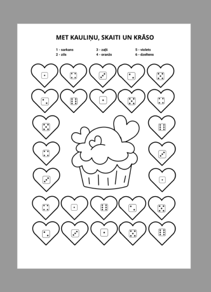 Katram kauliņa elementam ir sava noteikta krāsa.  Pēc dotā šifra jāizkrāso sirdis atbilstošā krāsā.