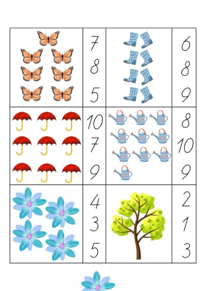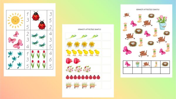 Failā 7 lapas, 3 veidu uzdevumi pavasarīgā tematikā. (1-10)