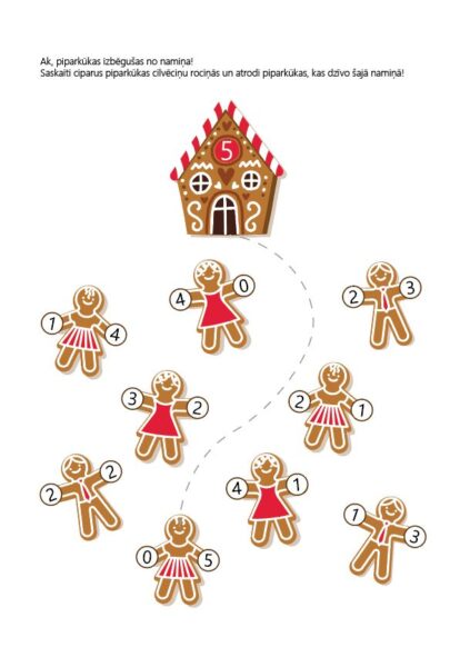 - 6 dažādas lapas ar piparkūku namiņiem, kur bērnam jāsavieno piparkūkas, kuru rociņās esošo aplīšu summa saskan ar namiņa skaitli;