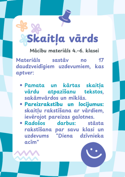 • Pareizrakstību un locījumus: skaitļu rakstīšana ar vārdiem, ievērojot pareizas galotnes.