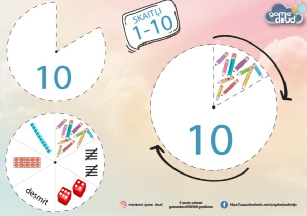 Spēlē iekļauts: 20 spēles laukumi, kurus grupē pa pāriem, veidojot skaitļu spinnerus. Spēles gaita: savieno cipara simbolu ar kartīti, uz kuras ir dažādi objekti, kuri atbilst cipara simbolam uz augšējās kartītes! Savieno tos kopā un izmanto kā spinneri. Bērns darbojas ar spinneriem apgūstot daudzuma un simbola atbilstību. Spēles mērķis: apgūt zināšanas par cipara un daudzuma atbilstību. Apgūt jēdzienus: “skaitlis”. “cipari”, “daudzums”, “cik daudz”, “kopā”. Papildus uzdevumi: var aizklāt ciparu un minēšanas spēli. Var salikt visus spinnerus un bērnam lūgt katrā spinnerī pagriezt konkrētu objektu un tad lūgt: “Izskaiti, cik ir zvaigžņu? Cik ir cimdu?” utt. Var zīmēt paši objektus, izmantojot spinnera paraudziņus. Rakstīt skaitļus, pēc tam, kad izskaitīti objekti uz spinnera. Esiet radoši! Game cloud!