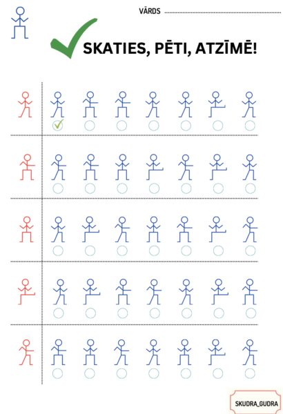Mācību materiāls paredzēts pirmsskolas 2. un 3. vecumposma bērniem. Līnijās attēlots cilvēciņš kustībā, bērna uzdevums- būt vērīgam un uzmanīgam, atrast un atzīmēt vienādos cilvēciņus. Papildus uzdevums- nostāties attēlotajā pozā! Materiāls sagatavots krāsainā un bez krāsu variantā (2. lpp).