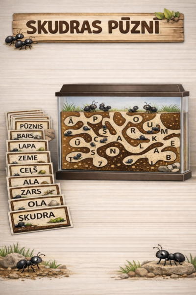 Bērni pēta skudru pūzni un meklē burtus, lai izveidotu vārdus, kas saistīti ar dabu un skudru dzīvi. Materiāls rosina domāšanu, uzmanību un valodas attīstību.