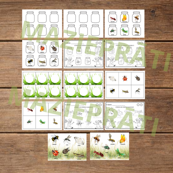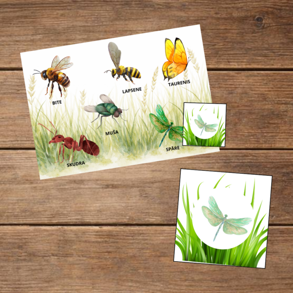 🌿 Komplektā arī fons ar kukaiņiem — bērns var meklēt un pielikt kartiņu pie pareizā attēla.