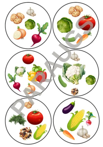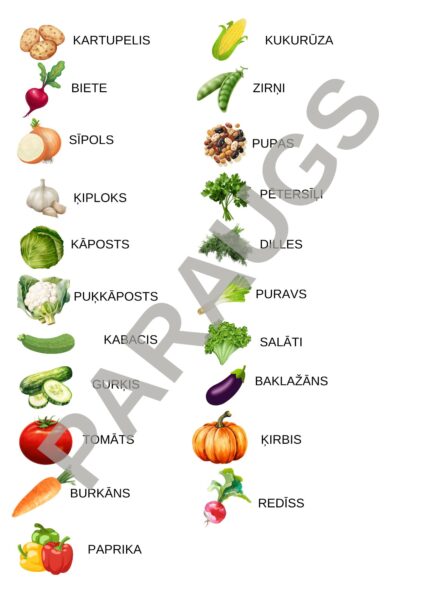 Materiāls sastāv no 1 titullapas, 1 lapas ar visu iekļauto dārzeņu attēliem un nosaukumiem (21 dārzenis), un 42 kartiņām ar dārzeņu attēliem ( 7 A4 lapas)