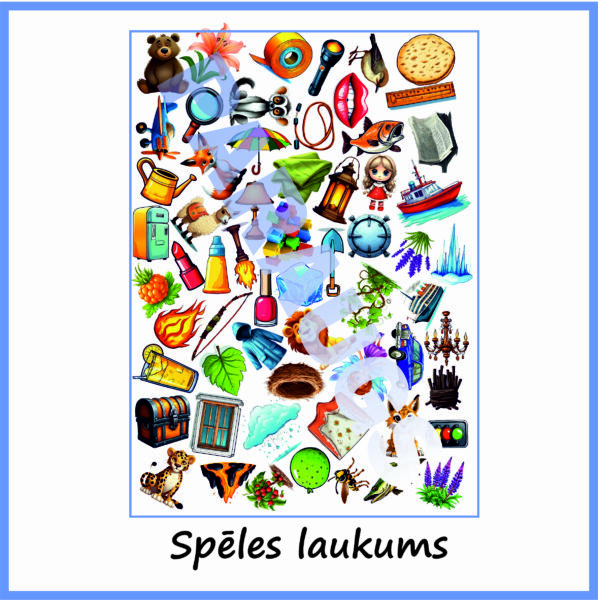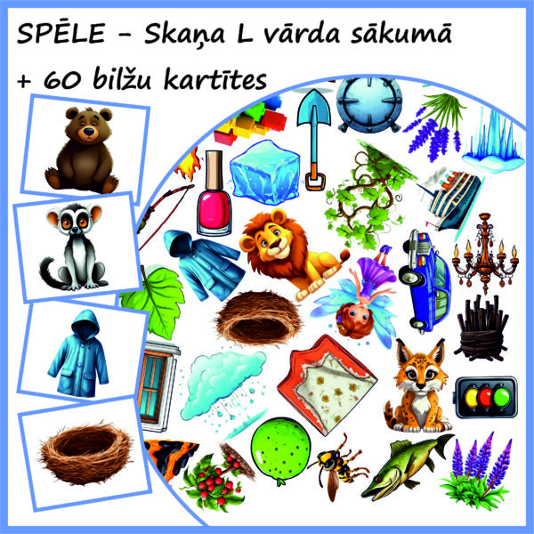 Spēles komplektā ietilpst – spēles laukums un 4 A4 lapas (60 attēli ar priekšmetiem, kas sākas ar skaņu L)