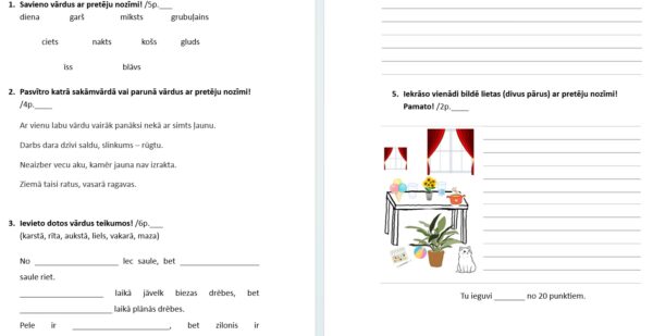 1. SR Atpazīst un lieto vārdus ar pretēju nozīmi jeb antonīmus. Darbā ir 5. uzdevumi