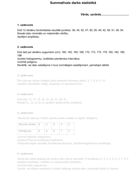 Statistikas kontroldarbs sastāv no 7 uzdevumiem, kuros skolēni aprēķina galvenos statistiskos rādītājus, veido un interpretē dažādus datu grafiskos attēlojumus, analizē datus, kā arī izdara secinājumus un pamato tos ar matemātiskiem argumentiem. Darba uzdevumi ir veidoti tā, lai skolēni ne tikai mehāniski lietotu formulas, bet arī izprastu datu nozīmi un spētu tos skaidrot.