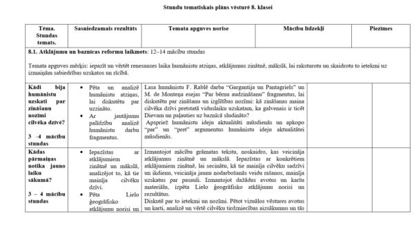 Stundu tematiskais plāns vēsturē 8. klasei