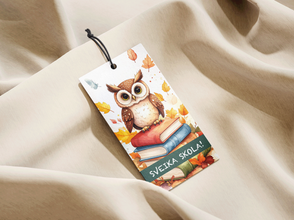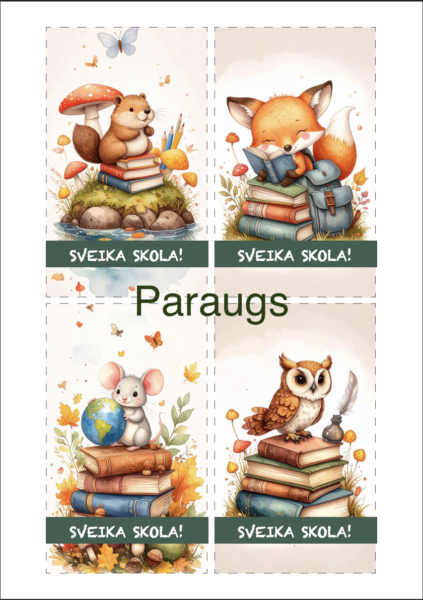 Katru kartiņu rotā sirsnīgi un bērniem draudzīgi ilustrēti dzīvnieciņi ar skolas atribūtiem – grāmatām, globusu, zīmuļiem, āboliem un rudens lapām. Dizains ir krāsains un pievilcīgs, lai radītu svētku sajūtu un padarītu pirmo skolas dienu īpašu.