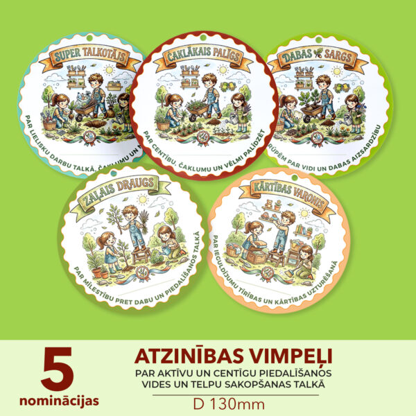 • atzinības vimpelīši / nozīmītes ar dažādiem tituliem (piemēram, “Super talkotājs”, “Dabas sargs”, “Kārtības varonis” u.c.).