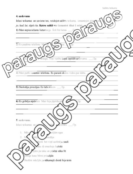 Darbā tiek pārbaudīta prasme atšķirt saliktu no vienkārša teikuma, spēja noteikt teikuma virslocekļus un lietot saikļus, kā arī prasme ievietot teikumā trūkstošās pieturzīmes. Darbs paredzēts 4., 5. klases skolēniem.