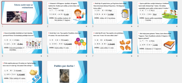 PowerPoint prezentācija ar 8 teksta uzdevumiem (divu darbību) un to atbildēm + darba lapa skolēniem, lai var darboties līdz patstāvīgi.