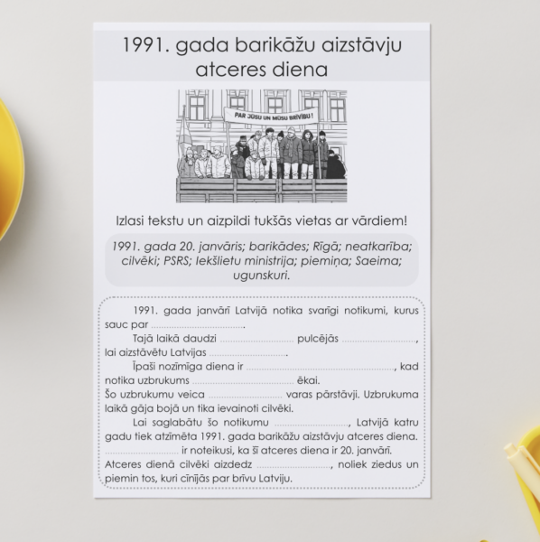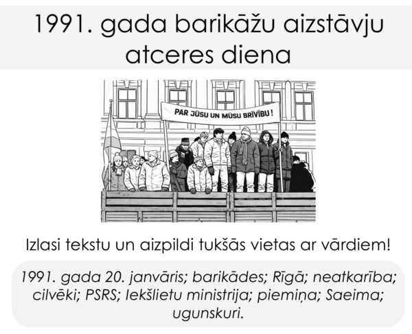 Izglītojošs un strukturēts lasīšanas uzdevums, kas palīdz skolēniem iepazīt 1991. gada barikāžu notikumus Latvijā un nostiprināt izpratni par valsts neatkarības nozīmi. Skolēniem jāizlasa teksts par barikāžu laiku un jāaizpilda tukšās vietas ar piedāvātajiem vārdiem (piemēram, barikādes, neatkarība, Rīgā, cilvēki, PSRS, Iekšlietu ministrija, Saeima, piemiņa, ugunskuri u.c.).