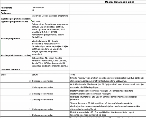 Tematiskais plāns “Dabaszinības 12.klasei”. Tematiskais plāns ir sastādīts pēc SKOLA 2030 ieteicamā stundu skaita katram tematam; ir pievienots katras stundas SR.