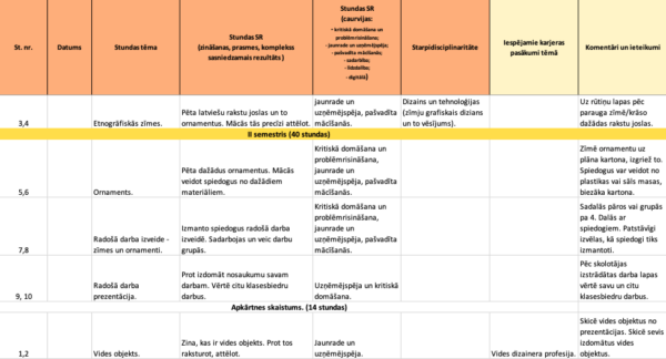 Tematiskais plāns vizuālajā mākslā 2. klasei. Plāns veidots, balstoties uz Skola2030 mācību paraugprogrammu. Tematiskas plāns veidots 70 mācību stundām (2 stundas nedēļā). Katrai lielajai tēmai ir noteikts stundu skaits. Visām mācību stundām ir tēmas, SR, caurviju prasmes un papildus ieteikumi tēmas realizācijai. Fails ir excel formātā.
