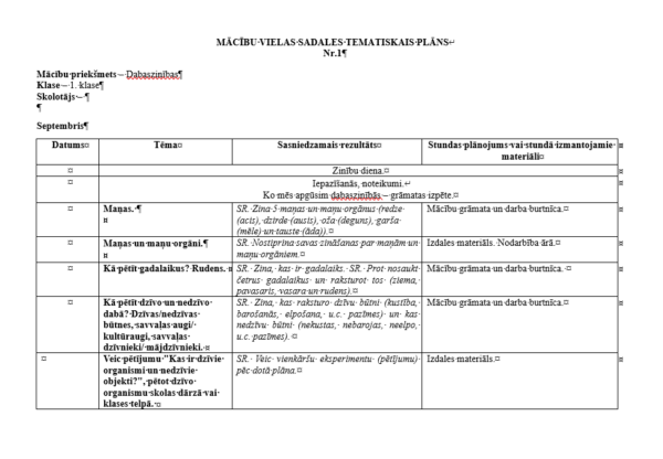 Tematiskie plāni dabaszinībās 1. klasei.Tematiskie plāni dabaszinībās 1. klasei.