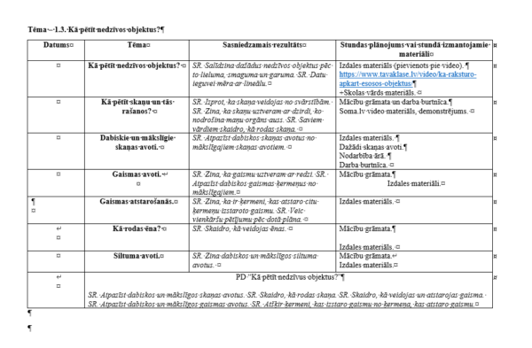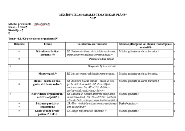 Variants Nr. 1 – ir veidots pēc mēnešiem, bet variants Nr.2 pēc apgūstamās vielas. Abi varianti ir visam mācību gadam.
