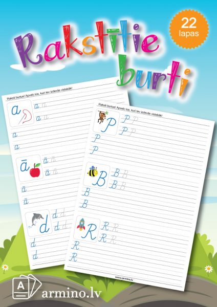 Komplektā ietilps 22 lapas – 11 lapas ar mazajiem burtiem un 11 ar lielajiem burtiem. Uz vienas A4 lapas izvietoti trīs burti jauktā secībā. Darba lapu var griezt trīs daļās un dot bērnam apgūt burtu rakstību sev vēlamajā secībā.