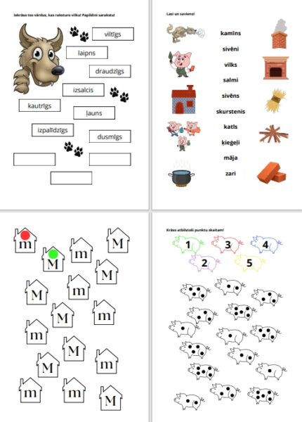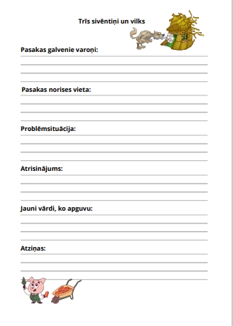 Fails sastāv no 11 darba lapām, kurās ietverti dažādi uzdevumi, kas palīdzēs pārrunāt un izprast pasakas notikumus, nostiprināt lasītprasmi, kā arī divas darba lapas ar skaitīšanas uzdevumiem.