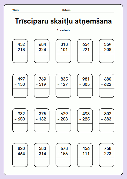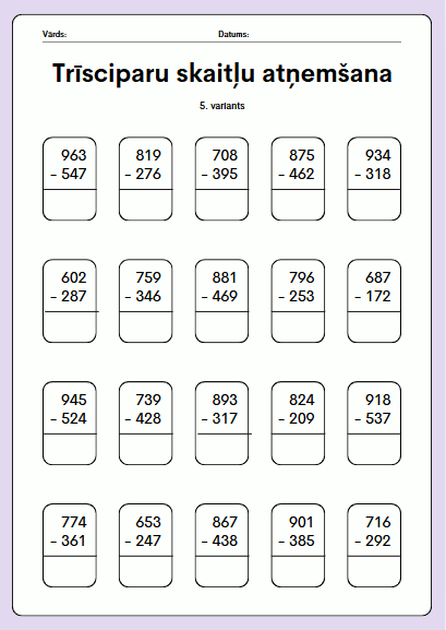Trīsciparu skaitļu atņemšanas darba lapas. Paredzētas 3.-5. klašu skolēniem matemātikas prasmju nostiprināšanai. Piemērotas gan patstāvīgam darbam klasē, gan mājasdarbiem. Dokumentā apkopoti 5 dažādi varianti (katrā lapā viens).