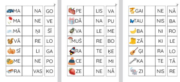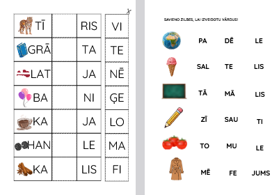 Failā ir 5 darba lapas: lasi un ielīmē trūkstošo zilbi; lasi zilbes un savieno.