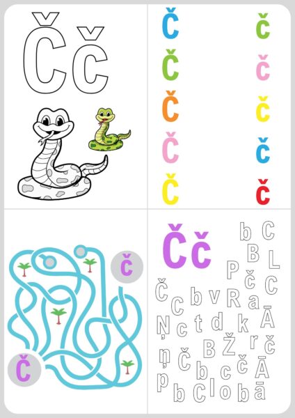 Katram alfabēta burtam viena lapa, uz kuras ir četri uzdevumi.