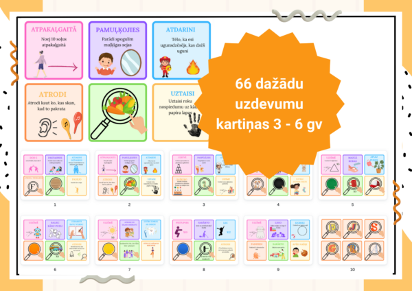 Materiāls satāv no 66 dažādu uzdevumu kartiņām, ko bērnam pildīt mājās, ikdienā, lai dienu padarītu aizraujošāku, uzdevumi ir gan fiziskas aktivitātes, gan lomu spēles, gan zīmēšana/ griešana / meklēšana, gan daudz dažādi citi, kā piemēram: