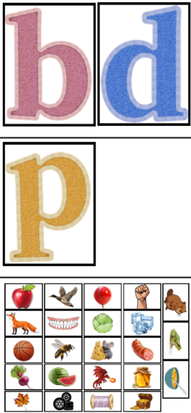 Komplektā iekļauti dažādi uzdevumi, kuros bērns lasa teikumus un veic noteiktas darbības ar burtiem – pasvītro visus b, apvelk visus d un iekrāso visus p. Papildus materiālā ir uzdevums, kurā bērns nosauc attēlos redzamos priekšmetus un sašķiro tos pie atbilstošā burta atkarībā no tā, ar kuru burtu vārds sākas. Materiāls, kurā noteiktā krāsā apvelk burtam piederošos attēlus. Attēlu kartiņas un vārdu kartiņas, kuras var lietot dažādi. Materiāls kur jaizvēlas pareizi uzrakstītais vārds!