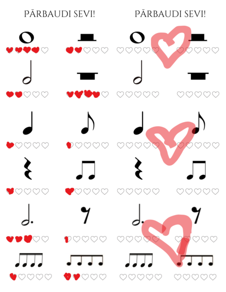 Iekrāso tik sirdis, cik nots ir sitienu gara. Ja 4 sitieni- iekrāso 4 sirdis, ja 0,5 sitieni, tad attiecīgi pusi no vienas sirds utt.