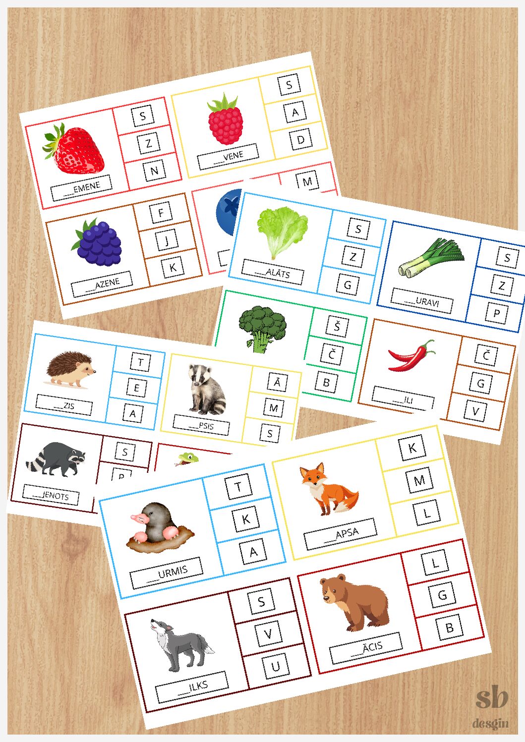Mācību materiāls bērniem par vārdu pirmajiem burtiem – 31 lapās attēloti dažādi priekšmeti ar nosaukumiem, kuros iztrūkst pirmais burts. Blakus piedāvāti trīs burta varianti, no kuriem bērnam jāizvēlas pareizais.