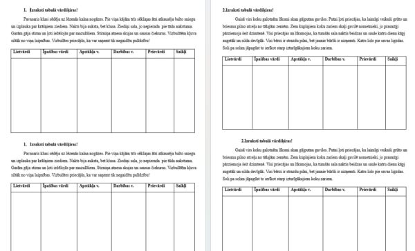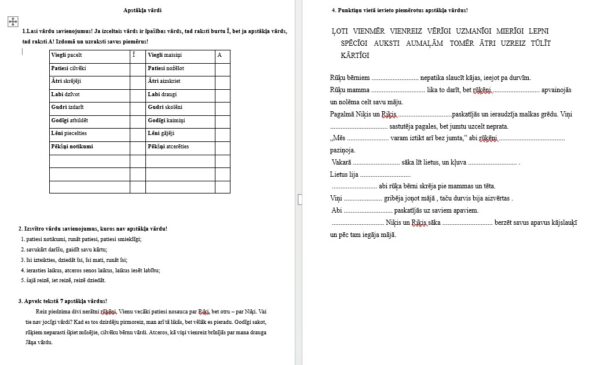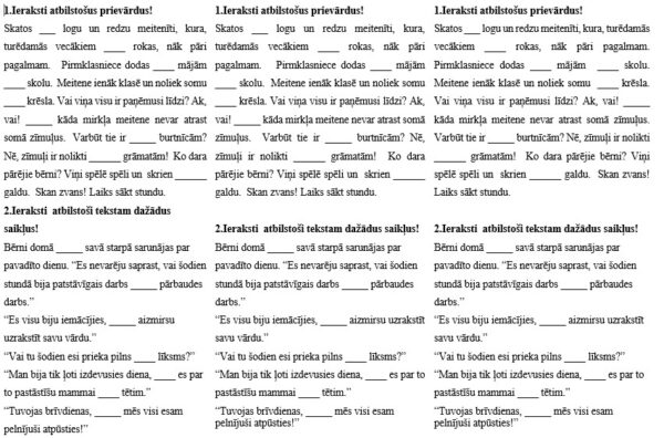Dažādi uzdevumi par vārdšķirām, to grupēšana, krustvārdu mīkla, saikļu un prievārdu ievietošana tekstā.
