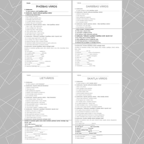 Šis uzdevumu komplekts palīdz skolēniem jautrā un strukturētā veidā apgūt četras galvenās vārdšķiras: īpašības vārdus, darbības vārdus, lietvārdus un skaitļa vārdus. Katra darba lapa ietver: