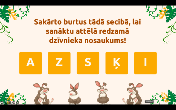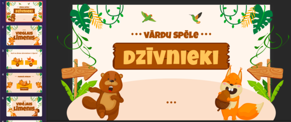 Prezentācija paredzēta individuālam darbam ar skolēnu vai darbam klases telpā. Spēlē ir 3 līmeņu uzdevumi (vieglais, vidējais un grūtais). Prezentācijas noslēgumā pieveinots īss teksts par dzīvnieku tēmu lasītpresmes attīstīšanai. Prezentācija pieejama pdf formātā.
