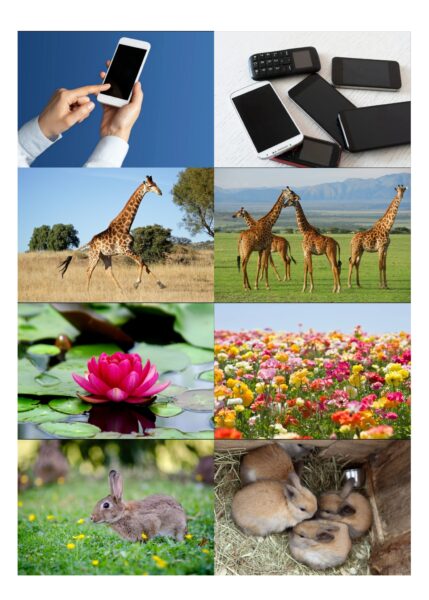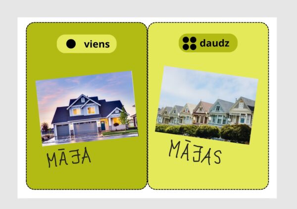 Materiāls sastāv no 10 A4 lapām, kur pirmā lapa ir ar zaļo škirojamo daļu, bet pārējās 9 ir attēlu kartītes ar vienskaitli un daudzskaitli – kopā 72 attēlu kartītes.
