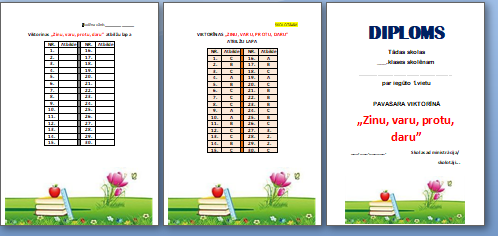 klāt atbilžu lapa skolēnam un darba vērtētāja lapa skolotājam, kā arī diploma paraugs.