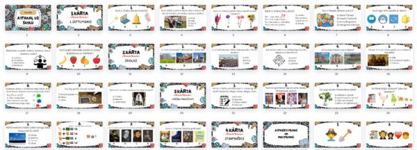 1. Prezentācija ar jautājumiem. Kopā 5 kārtas (1. septembris, skolas, mācību priekšmeti (jautājumi par dažādām tēmām), starpbrīdis un attēli) ar 8 jautājumiem katrā. Pirmajās trīs kārtās jautājumi ar atbilžu variantiem, bet pēc tam jāatpazīst dažādas filmas un multfilmas emoji simbolos un ar skolu saistīti priekšmeti attēlos.