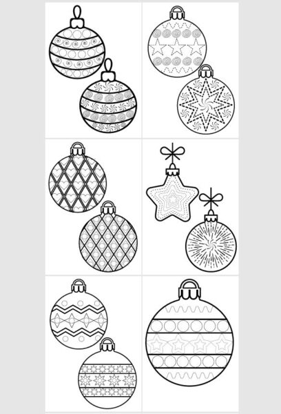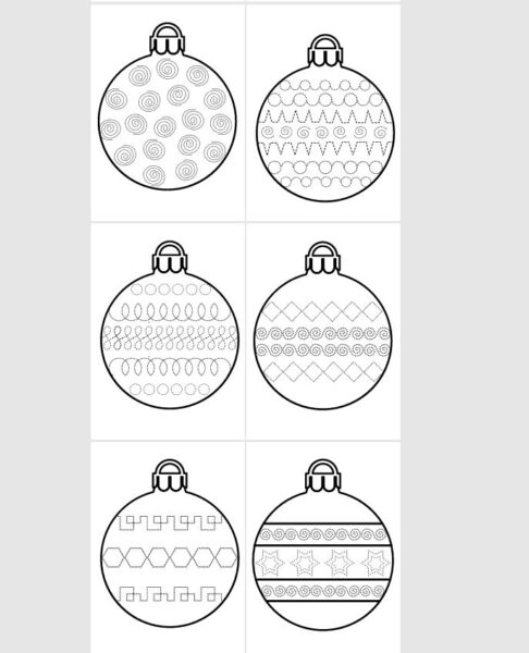 12 lapas ar eglīšu rotājumiem (bumbām), lai vingrinātu sīko pirkstu muskulatūru.