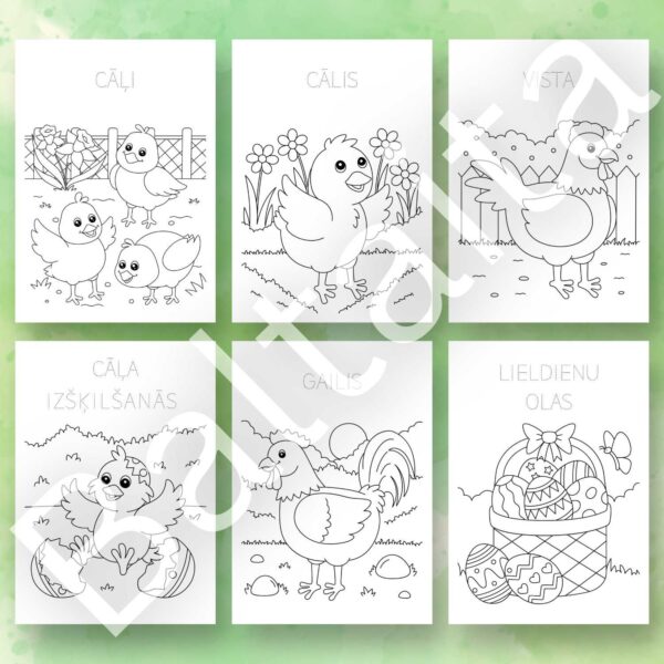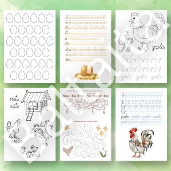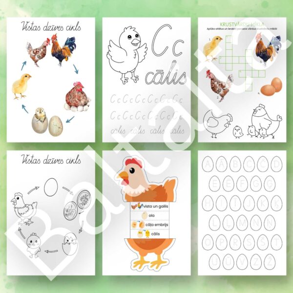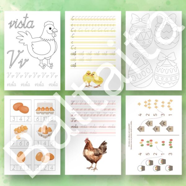 24 darba lapu komplekts Lieldienām par vistām – dzīves cikls, uzdevumi rakstīšanai un skaitīšanai, krāsojamās lapas, alfabēta uzdevumi un citi uzdevumi.
