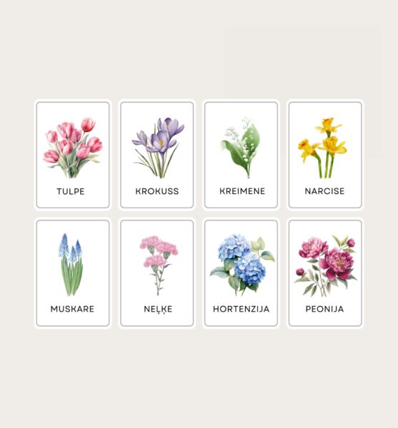 16 ilustrētas ziedu kartītes (8 kartītes uz A4 lapas)ar nosaukumiem (piemēram, tulpe, margrietiņa, magone, roze, peonija, narcise, hiacinte)